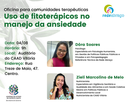 A Subsecretaria de Estado de Políticas sobre Drogas (Sesd) vai promover no dia 04 de agosto, às 9 horas, a oficina “Uso de fitoterápicos no manejo da ansiedade”. A capacitação, voltada para comunidades terapêuticas (CTs), será realizada no Auditório do Centro de Acolhimento e Atenção Integral sobre Drogas (CAAD), no Centro de Vitória.