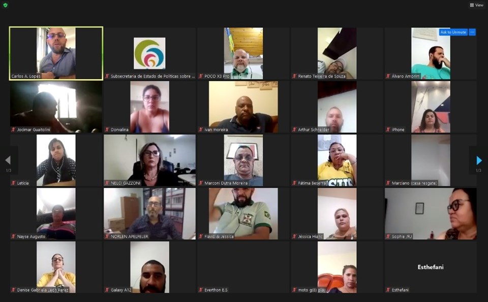 A Rede Abraço realizou a aula inaugural do curso de extensão de Monitoria em Dependência Química, na última sexta-feira (26), ao vivo na plataforma Zoom. O evento contou com a participação de representantes da Subsecretaria de Estado de Políticas sobre Drogas (SESD), da diretora-presidente da Escola de Serviço Público do Espírito Santo (Esesp), Nelci do Belém Gazzoni, além dos inscritos no curso.