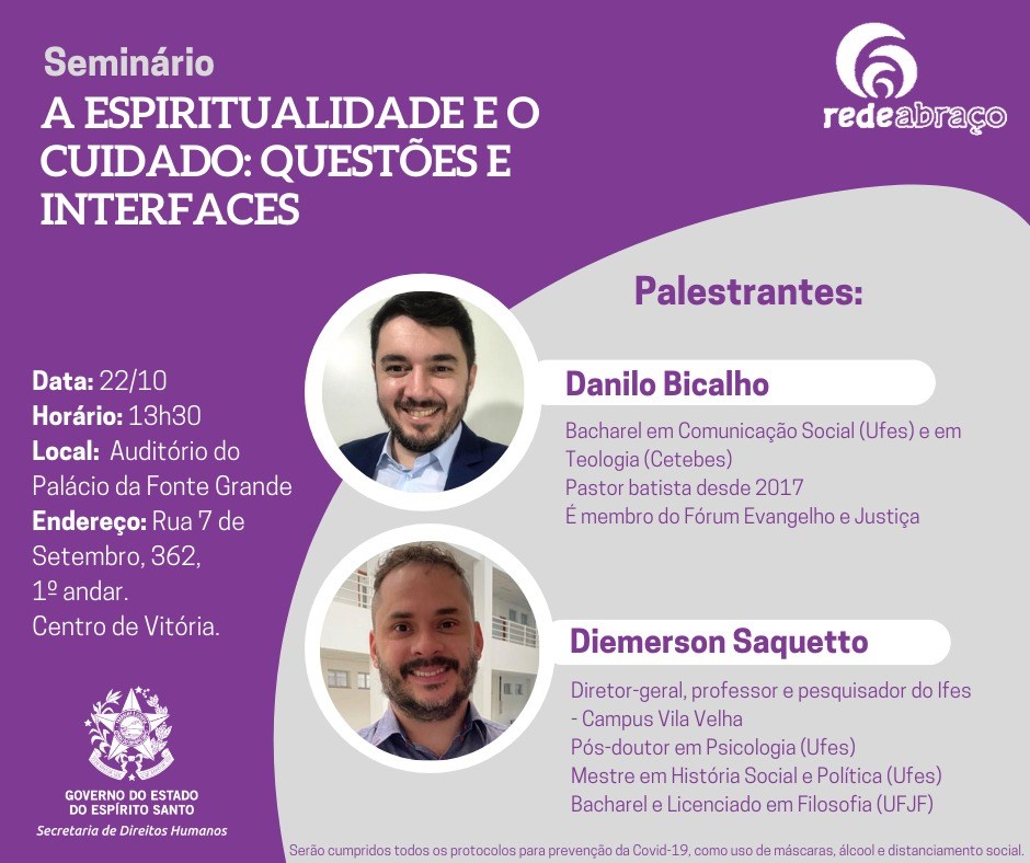 A Secretaria de Direitos Humanos (SEDH), por meio da Subsecretaria de Estado de Políticas sobre Drogas (SESD), promove, no próximo dia 22 de outubro, às 13h30, o seminário “A espiritualidade e o cuidado: questões e interfaces”. O evento será realizado no Auditório do Palácio da Fonte Grande, no Centro de Vitória.
