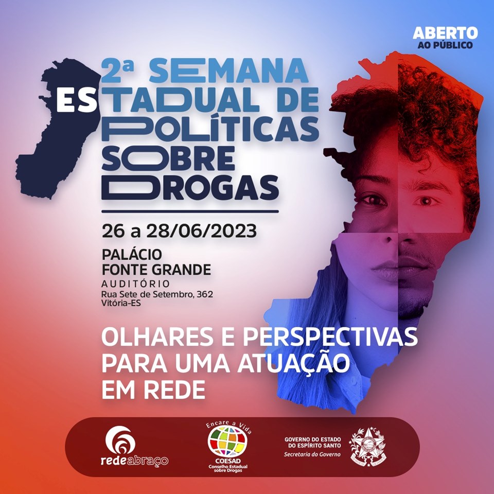 O Governo do Estado, por meio da Subsecretaria de Estado de Políticas sobre Drogas (Sesd) e do Conselho Estadual sobre Drogas (Coesad), promove entre os dias 26 e 28 de junho de 2023 a 2ª Semana Estadual de Políticas sobre Drogas. O evento será realizado no Auditório do Palácio da Fonte Grande, no Centro de Vitória.